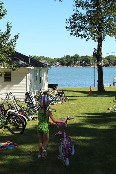 There will be a mandatory pre-race meeting and walk through at 9:30am by the kids transition area. During this meeting each stage of the race will be explained to the athletes. We want this race to be as much about learning as about having fun. As a group they will walk down to the lake to begin the race. There will be several life guards in the water, the 25 yard swim will begin in a time trial fashion.